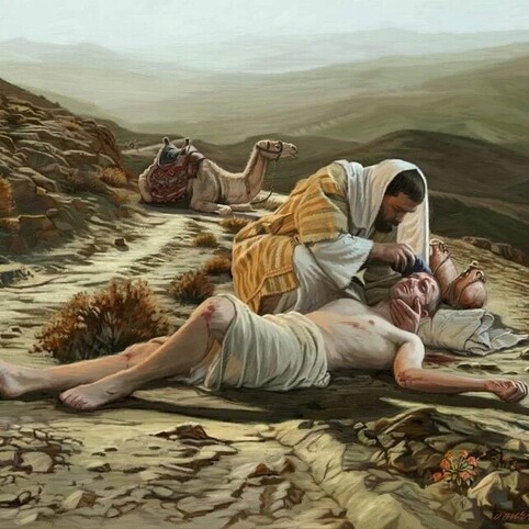 En una cuneta se encuentra un hombre malherido que ha sido asaltado por ladrones. Más lejos, después de haber dado un rodeo, caminan un sacerdote y un levita. Junto al herido, sosteniendo su cabeza, está el hombre bueno de Samaría. Ustedes acaban de escucharla y conocen bien la parábola.
