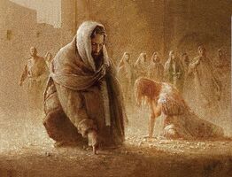 Observamos a Jesús, a los fariseos, a la mujer y a la gente. Se produce un silencio abrumador. Jesús calla y se pone a escribir en el suelo con un dedo. No distinguimos bien lo que escribe. Tengo la sensación de que podría haber escrito algo inconfesable de nuestro pasado.